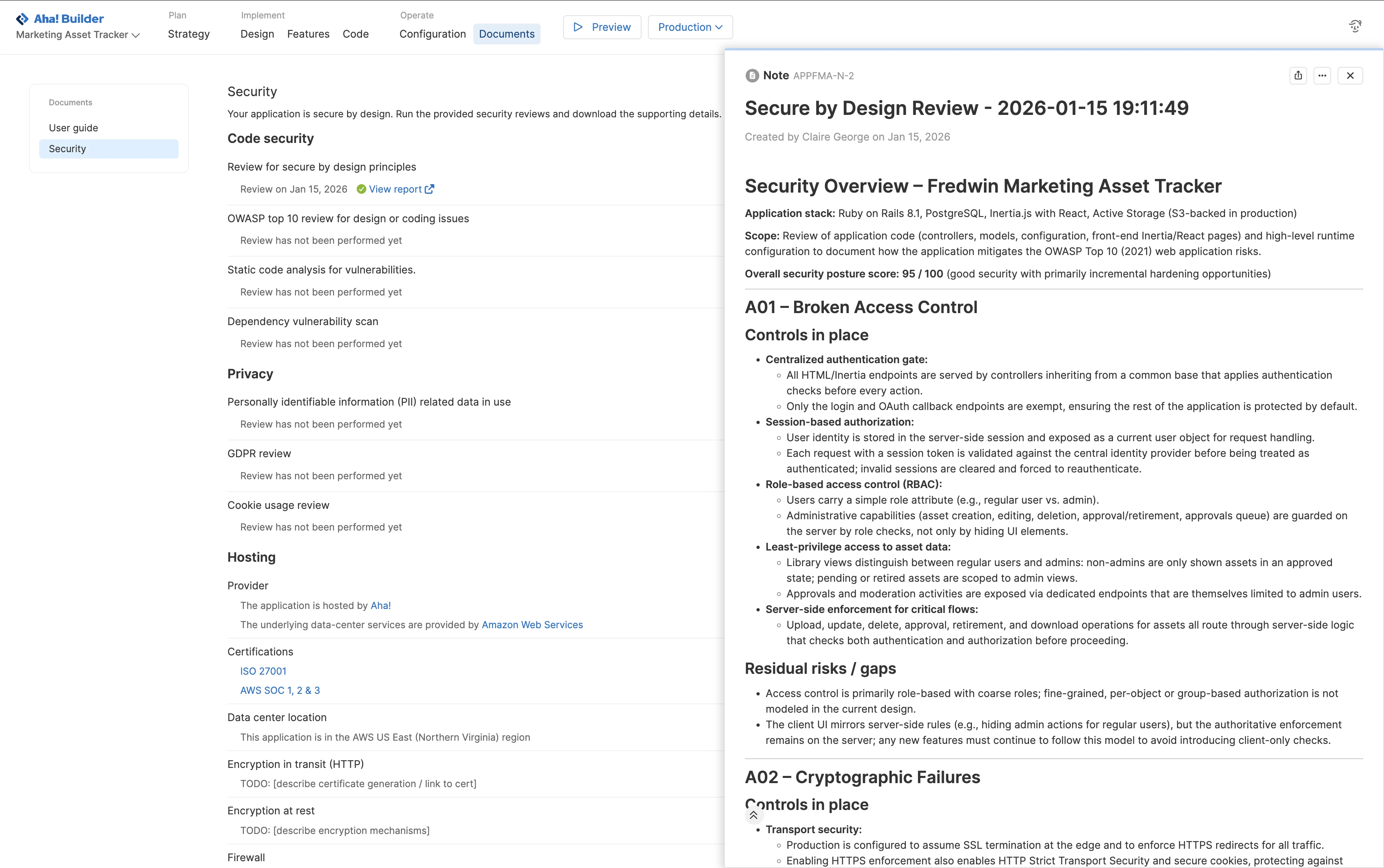 Everything you need to operate a reliable and scalable enterprise application is built in: database, authentication, and secure hosting. Run quality, security, and compliance reviews before going live. Aha! is also ISO 27001 certified, so we follow a globally recognized operational standard.