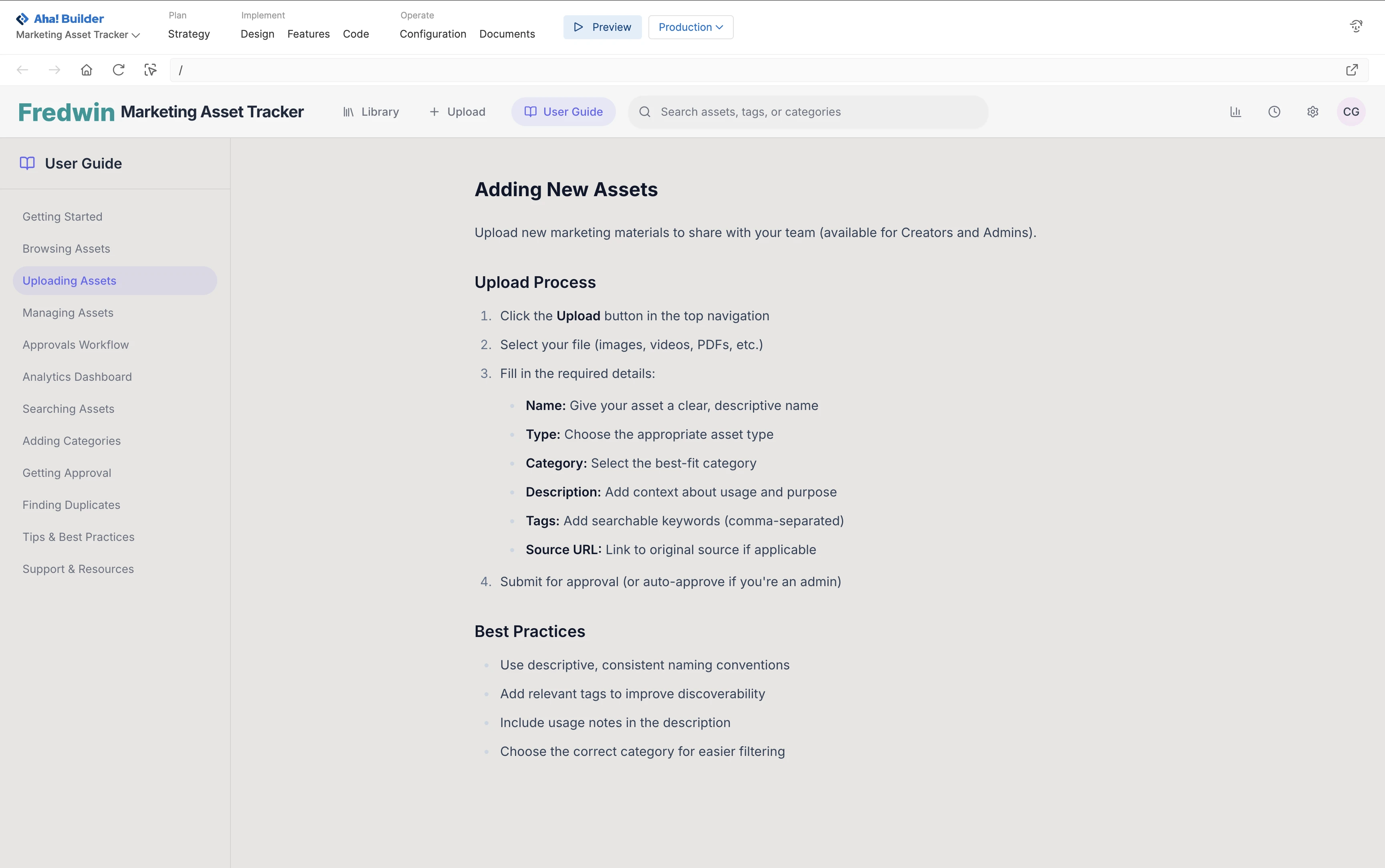The AI assistant will generate a comprehensive user guide for your application so you do not need to spend time writing documentation manually. Your users will understand how to use the application from day one because Aha! Builder creates the training and support material for you.